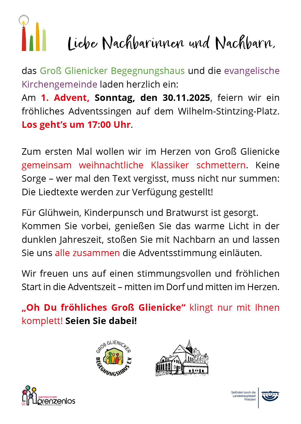 In diesem Jahr wird auch Groß Glienicke ein neues, strahlendes Kapitel in seiner Adventsgeschichte aufschlagen: Die große Tanne vor dem Pfarrhaus wird zum ersten Mal festlich illuminiert. Am 30.11., pünktlich zum 1. Advent, wird unsere Freiwillige Feuerwehr Groß Glienicke die Lichterkette anbringen. So wird ganz in der Nähe zur neuen Dorfmitte unser schöner Ort in warmes Licht getaucht – ein Gruß an alle, die vorbeigehen, und ein Zeichen dafür, dass Gemeinschaft und Hoffnung auch in unserer Zeit leuchten können. Dieses Licht soll nicht nur festlich aussehen, sondern auch erinnern: Gott sucht, was verloren ist. Er bringt heim, was sich verirrt hat. Er heilt, was verwundet ist. Und er lässt die Sonne seiner Gerechtigkeit aufgehen – mitten im Winter, mitten in unserer Welt, mitten in Groß Glienicke.