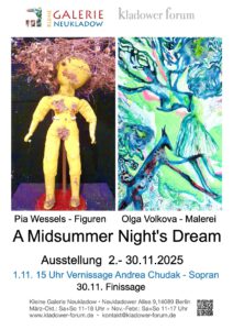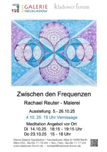 Rachael Reuter: Zwischen den Frequenzen – Vernissage und Ausstellung – Kladower Forum e.V. Rachel Reutter: Zwischen den Frequenzen, Ausstellung und Vernissage „Während sich die Welt zunehmen chaotisch und herzlos anfühlt, öffnet uns Kunst eine Tür zu Schönheit, Liebe und Hoffnung, die weit über uns selbst hinausgeht.“ Höchst interessante Kunstwerke! Torgebäude Gutspark Neukladow, Neukladower Allee 9, 14089 Berlin – Ausstellung bis 26. Oktober 2025, geöffnet Sa/So 11 – 18 Uhr